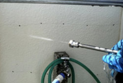 防音機能の付いた高圧洗浄機で、外壁や屋根の塗装面にこびりついたカビや汚れを洗い流します。